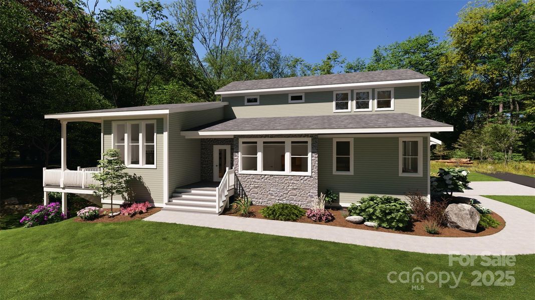 An original modern mountain design in Buncombe County’s premier north-end community: Reems Creek Village. Behind a stone entry, the vaulted great room opens with a soaring wall of glass overlooking Kirin Creek and the surrounding woods, creating a dramatic yet intimate retreat. A ceiling-height stone fireplace, built-ins, and French doors extend the living area to a covered deck where sunsets and gatherings unfold.