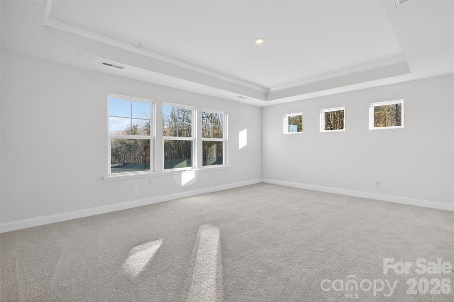 Upstairs, a versatile loft provides additional living space alongside three bedrooms, an upper-level laundry room, and a private primary suite with tray ceiling, walk-in closet, and a 5-foot walk-in shower.