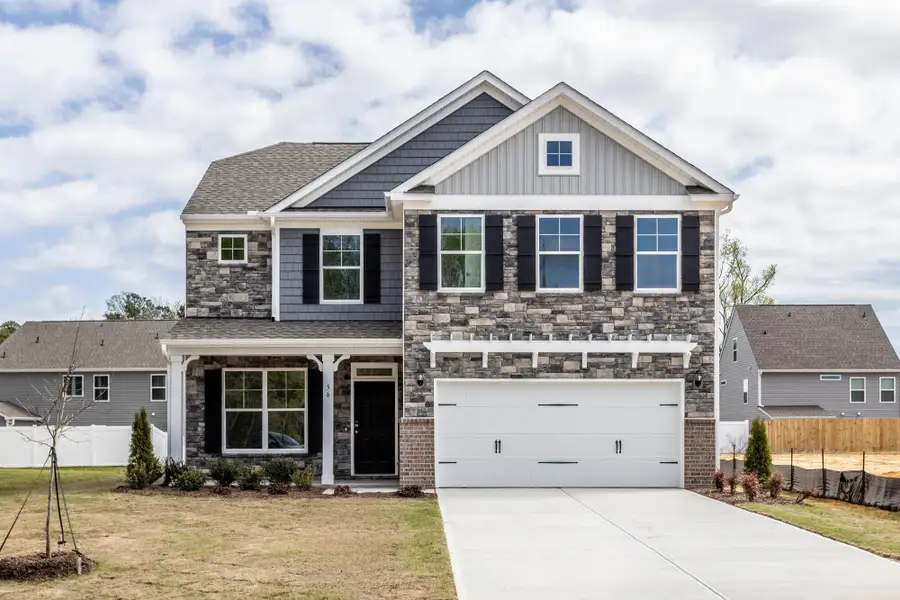 The Drexel is a two-story, four-bedroom, two-and-a-half-bath home with a formal living room, formal dining room, kitchen with island and a pantry, spacious great room, and a screen porch. The second floor features four bedrooms, including the primary suite with a large closet, an upstairs laundry, an additional full bath, and a loft area.