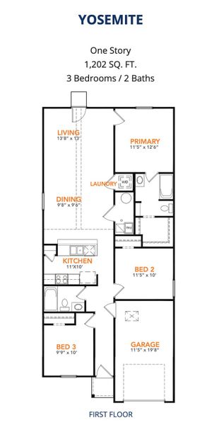 The Yosemite Plan from our Freedom Series is a cozy and efficient single-story home featuring 3 bedrooms, 2 bathrooms, a 1-car garage, and 1,202 square feet of smartly designed living space.