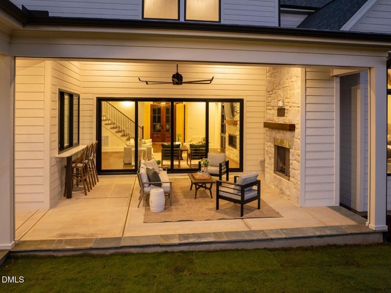 The gourmet kitchen is designed for a home chef, with custom cabinets, quartz countertops, a large island, and two pantries, including a scullery and a butler's bar. Glass doors lead to a covered porch with a built-in grilling station, ideal for outdoor entertaining. The outdoor space also includes a phantom-screened porch with a fireplace.