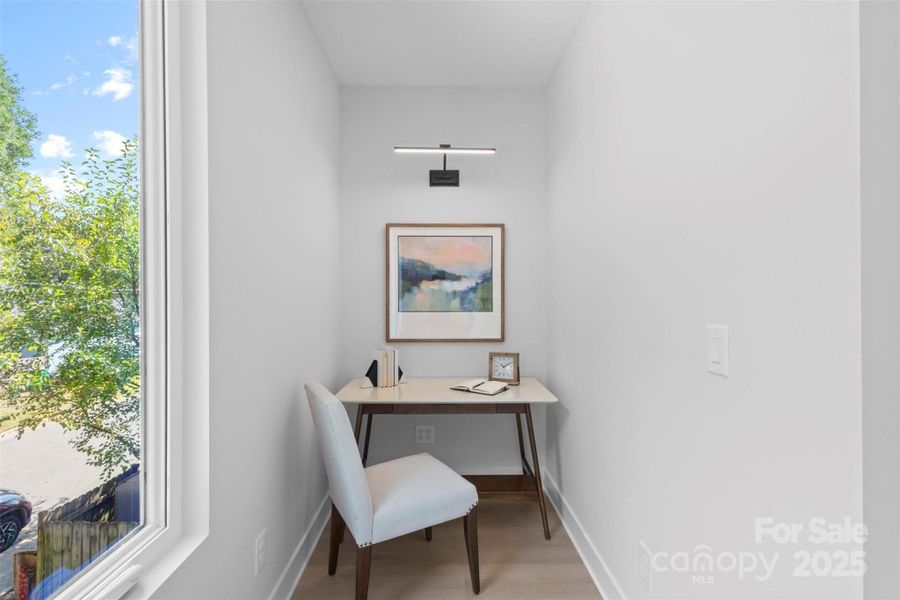 Gourmet kitchen: waterfall quartz island, butler’s pantry, and wet bar. Sliding glass doors out to Screened porch + TimberTech composite decking. Two-car garage with large utility closet, EV pre-wire, hot/cold hose bib, and oversized mudroom with storage. Wide-plank hardwoods, designer lighting, bespoke features. Third-level bonus + kitchenette + terrace with an amazing skyline view. Private, fenced backyard (~0.17 ac). Conditioned crawlspace | Foam-insulated attic for comfort & efficiency. Walkable to Plaza Midwood/NODA cafés, breweries, greenway; ~8–10 min to Uptown.