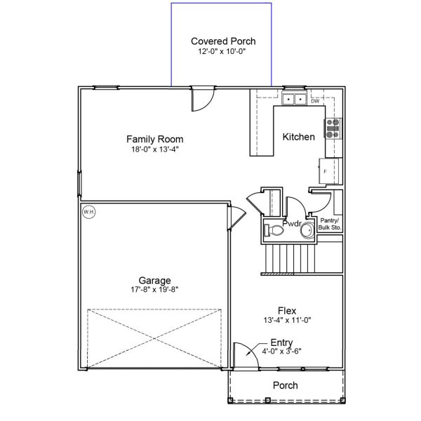 The entryway of this four-bedroom, two-and-one-half-bathroom Guilford plan opens onto a flex space. Just past it, the kitchen leads to a walk-in pantry and the great room. Located just off the great room is a covered back porch. Upstairs, a laundry room and a full bathroom are conveniently located near the three spare bedrooms. The primary bedroom with a vaulted ceiling is connected to its primary bathroom and walk-in linen and clothes closets.
