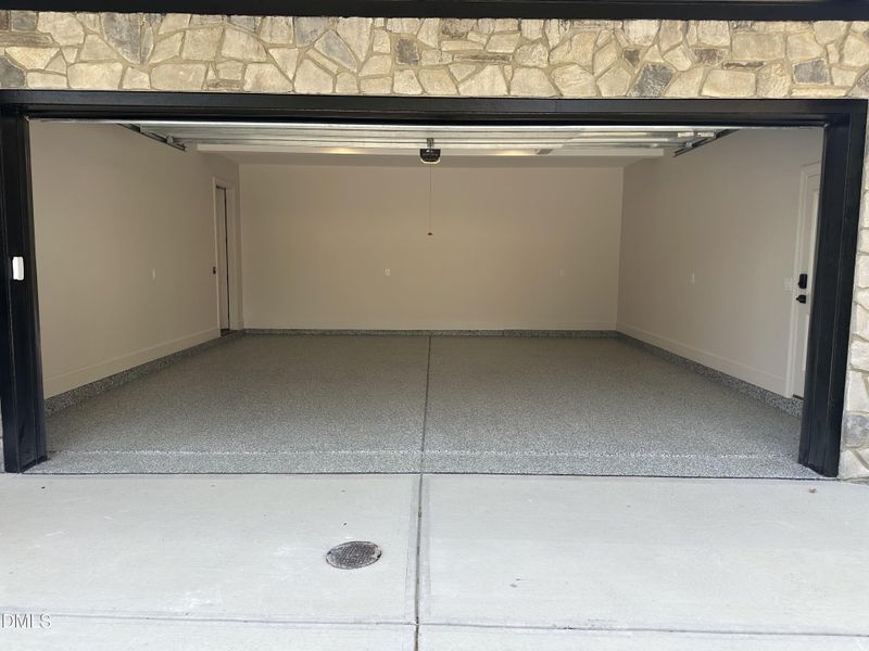 The two car garage has Polyaspartic Epoxy floor coating and a car charging station.