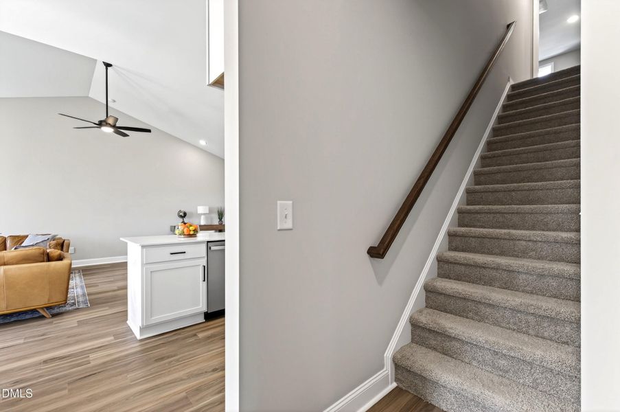 The heart of the home features an open-concept layout connecting the kitchen, breakfast nook, and family room for an easy flow from morning routines to evening downtime. The kitchen includes a center island with seating and stainless steel appliances, with the breakfast nook positioned nearby for casual dining. The family room is highlighted by vaulted ceilings, bringing extra volume and natural light into the main living area.