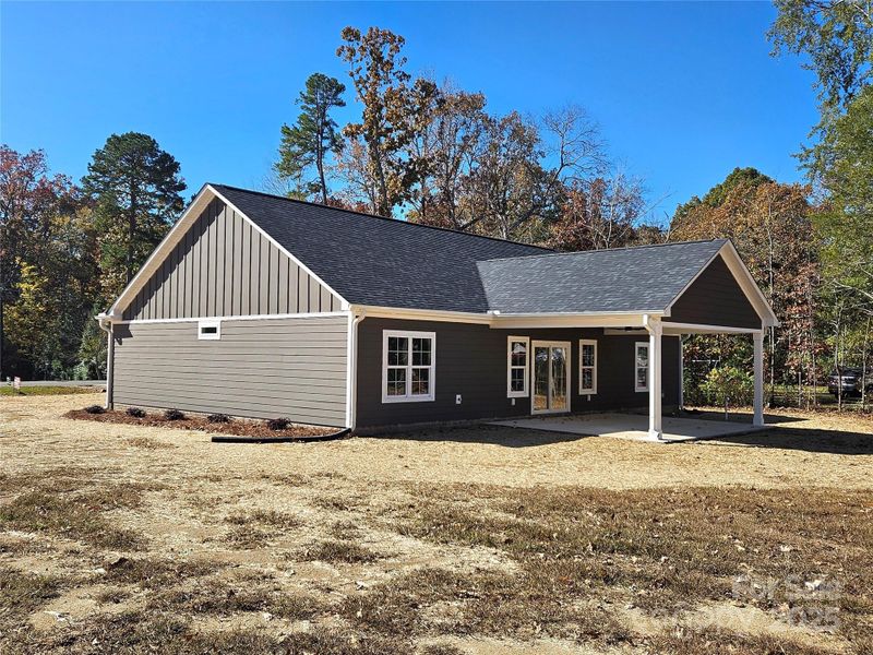 This beautifully crafted new construction home exudes quality and attention to detail throughout. The home’s inviting curb appeal features two-tone fiber cement siding accented by wood columns and shutters that add warmth and character. Inside, luxury vinyl plank flooring runs seamlessly throughout the home, offering durability, low maintenance, and modern style. Black fixtures accent each space, providing a sleek and cohesive look while the open, split floor plan creates an easy flow between living spaces. Adorned with tray ceilings in both the living room and primary bedroom, adds yet another level of quality and design. The kitchen is the heart of the home offering a spacious island and breakfast bar, accented with pendant lighting, granite counter tops, a tile backsplash and is complete with a deep farm sink and soft close cabinetry while the primary suite features a massive walk-in closet and a charming barn door that leads into the primary bath where you’ll find dual sinks and a custom tile shower. Step outside to the 17' by 22' covered back porch — perfect for relaxing or entertaining, no matter the season. In addition, the home also offers 144 square feet of attic space, providing plenty of extra storage!