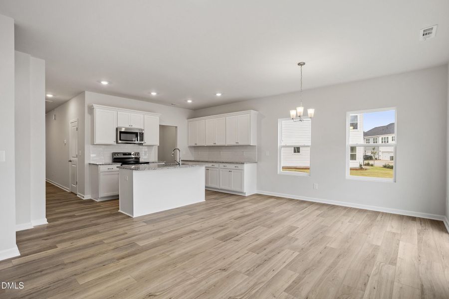 Welcome to this charming 2-story END UNIT townhome in the sought-after Georgia's Landing community! Step inside to an open-concept layout, where the spacious kitchen with a large island seamlessly connects to the bright living area, all featuring durable luxury vinyl flooring. A convenient drop zone near the garage helps keep everyday items organized.