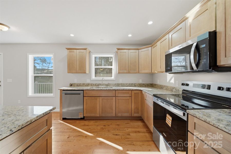 Granite Falls, NC. Designed for easy living, this ONE-LEVEL home offers an open layout, modern finishes, and plenty of natural light. You're going to love the warm hardwood flooring as well as the arched doorways. The spacious living room delightfully opens to the kitchen & dining area. The kitchen offers beautiful custom cabinetry, granite countertops, center island and stainless appliances. The owner's suite features hardwood floors with a large