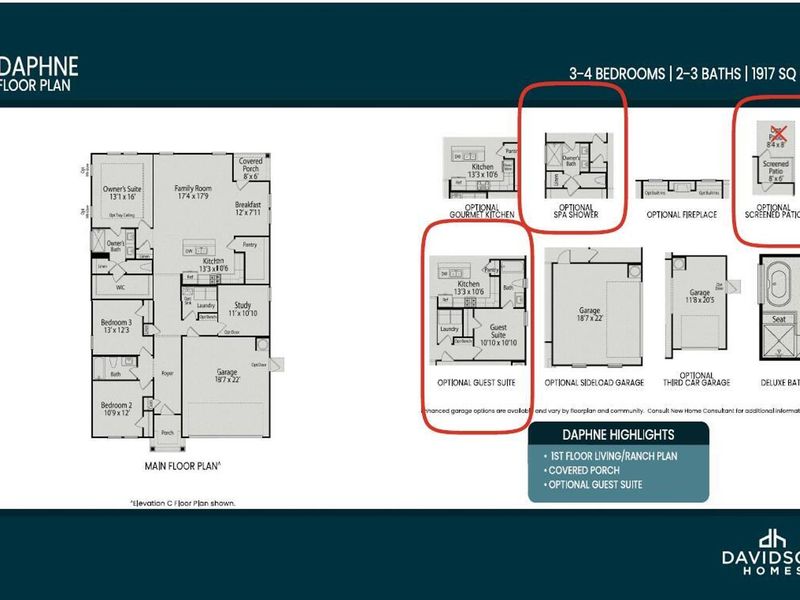 Ranch design- Daphne's open-concept floor plan! Featuring tons of natural light, the family room is perfect for entertaining, and the home's kitchen features large quartz island, breakfast nook and view of family room with cozy firepalce. The Owner's Suite offers plenty of space, and its closet has room to spare. Covered rear patio. Secluded guest suite with private bath.