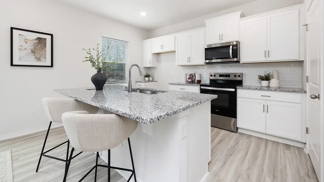 Upon entering, you are greeted by a foyer that invites you directly into the center of the home. At its heart, you’ll find a spacious family room that blends with the kitchen, creating an expansive and airy feel. The kitchen is well equipped with a walk-in pantry, stainless steel appliances, and a breakfast bar, perfect for cooking and entertaining. A flex room on the first floor can be used as a home office or craft room.