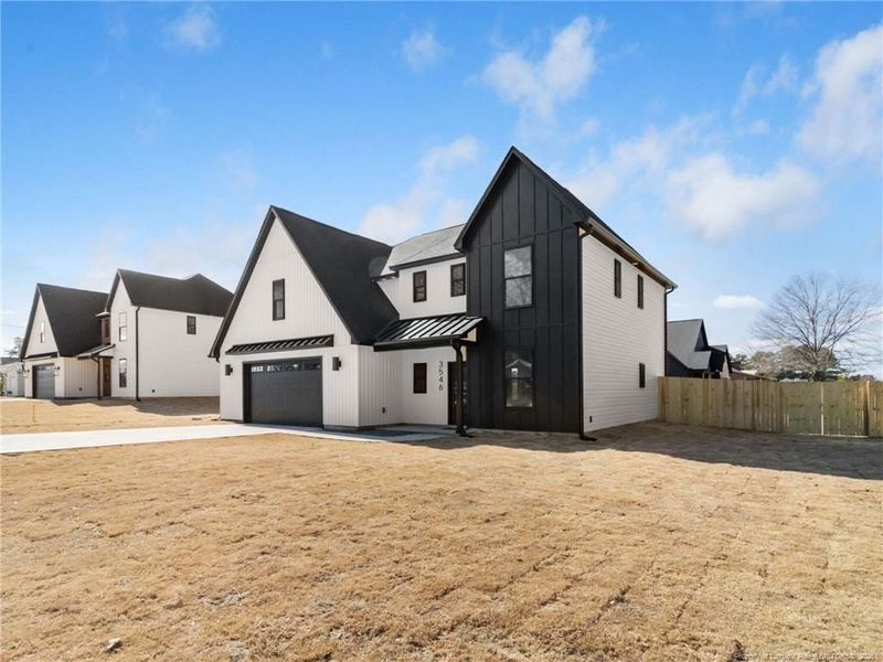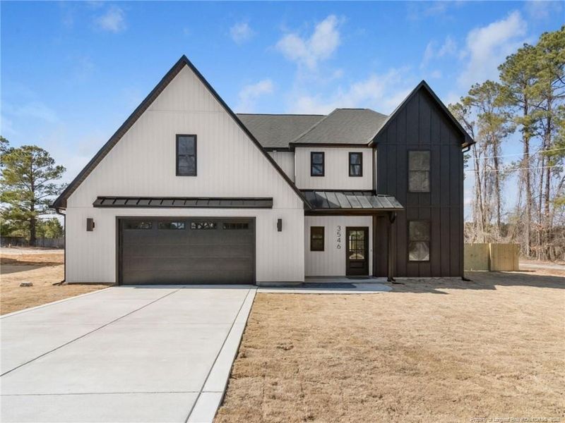 $8,500 Builder Incentives!! Discover this custom-built new construction home by House Project, offering a truly one-of-a-kind modern design in the desirable Jack Britt district. This striking two-story home showcases a bold contemporary exterior featuring black board and batten accents, sleek metal roofing details, and black-on-black windows—a standout architectural style that sets it apart from anything else in the area.Step inside to an open-concept layout with 9-foot ceilings on the main level and abundant natural light pouring through large statement windows in the living room. The designer kitchen features custom frameless cabinetry, a large 8-foot island, and elegant modern finishes that flow seamlessly into the spacious living area centered around a modern electric fireplace. The dining area offers a beautifully designed space for gathering and entertaining but can easily serve as a home office or flex room to suit your needs. A spacious mudroom with built-in storage provides convenience and functionality. Upstairs, retreat to the expansive primary suite, featuring a luxurious ensuite with dual shower heads and an oversized walk-in shower. Every detail throughout the home reflects thoughtful design, quality materials, and a cohesive contemporary aesthetic. If you’re seeking a home that stands out for its design, craftsmanship, and location, this custom House Project build is one you won’t want to miss.
