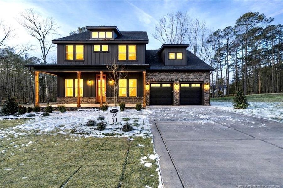 Welcome to Copper Ridge Estates & The Woodside Floor Plan. This beautifully designed home on the water blends luxury, comfort with thoughtful craftsmanship. Enter the foyer where 10ft ceilings, custom crown molding & LVP flooring set an elegant tone that carries throughout the main level. The open concept creates a bright & inviting flow ideal for everyday living and entertaining. The formal dining room gives a refined space for gatherings, while the first-floor study and powder room provide convenience and flexibility. The spacious family room centers around the gas fireplace and flows into the designer chef's kitchen accented with Quartz countertops a large waterfall-edge island, stained 42'' Hickory Cabinets, backsplash, stainless appliances with double oven & walk in pantry. The breakfast area over looks a serene, screened porch with views of the pond perfect for morning coffee or relaxing evenings. The vaulted ceiling in the first-floor master bedroom inspires a true retreat. The spa-inspired bathroom features tiled flooring and walk in tiled shower, two separate vanities and two walk in closets. Upstairs you will find three additional great size bedrooms, Loft area & additional flex area ideal for gym, play area or extra office giving everyone space and privacy. This home includes an attached two car garage equipped with EV Charger station and the house prewired for a standby generator. Easily accessible to RTP, Ft Bragg and Pinehurst/Southern Pines