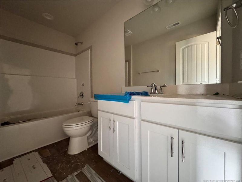 DRAYTON. Foyer with two-piece crown molding and wainscoting includes a dining room, coat closet, and convenient half bath. The open great room showcases an electric fireplace with a mantle and black granite surround and flows into the kitchen, which features a large island in ''Sahara'', ''Trigato'' quartz countertops, white shaker cabinets, white subway tile backsplash, corner pantry, and stainless steel appliances including a microwave, dishwasher, and smooth top range. The breakfast area leads to the covered rear porch. Upstairs, an open loft area provides additional living space, with a nearby linen closet and laundry room. The second-floor primary suite features a cozy sitting area and an ensuite bathroom containing a dual quartz sink vanity, garden tub, walk-in shower, and spacious walk-in closet. Three additional bedrooms and a full hall bathroom complete the second floor. Exterior highlights include low-maintenance vinyl siding with shake accents, stone skirt, dimensional roof shingles, a spacious front porch, and a SW ''Iron Ore'' front door with smart keypad entry to the home. This corner lot home includes a 2-car garage with a dedicated work area, fiber optic internet service availability, Energy Plus certification, and a 1-2-10 builder in-house warranty. Long Point Reserve combines small-town charm with modern convenience, offering amenities such as a swimming pool, clubhouse, proposed dog park, and easy access to Southern Pines, Fort Bragg, and Raleigh.