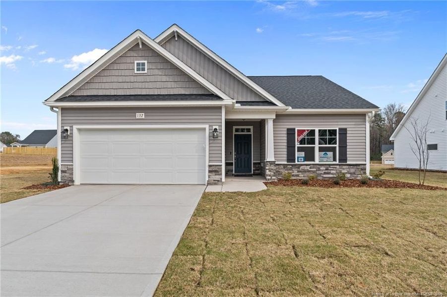 The Weymouth Plan boasts a Foyer with two-piece crown molding and wainscoting opens to kitchen/dining area. The kitchen overlooks the great room and boasts ''New Willow White'' quartz countertops, white shaker cabinets, a ''Graphite'' island, white subway tile backsplash, corner pantry, dining area, and stainless steel appliances including a microwave, dishwasher, and smooth top range. The spacious great room showcases a linear electric fireplace with a board-and-batten accent wall in ''Iron Ore'' and access to the rear covered porch. A mudroom is conveniently located off the garage entry. The primary suite features a tray ceiling with crown molding and an en-suite bath with a dual quartz sink vanity, walk-in shower, garden tub, linen closet, and a generous walk-in closet. Two additional bedrooms off the foyer share a full hall bath, while a fourth bedroom near the primary suite is ideal for guests or a home office. Exterior includes low-maintenance vinyl siding with shake and board and batten accents, a stone skirt, dimensional roof shingles, and a covered front porch with a SW ''Outer space'' door and smart keypad entry. This home also features a 2-car garage, fiber optic internet availability, Energy Plus certification, and a 1-2-10 in-house builder warranty.