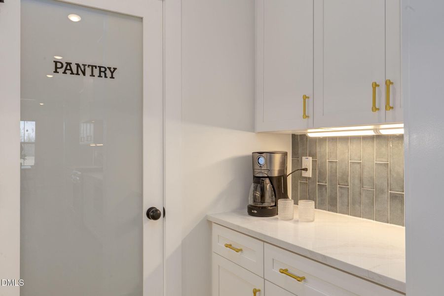 Inside, you are welcomed by a light-filled foyer flanked by a private study with French doors and a formal dining room accented with classic wainscoting. The heart of the home opens into an airy kitchen + living room concept anchored by a fireplace with built in shelving. The kitchen offers custom natural oak real wood cabinetry, a butler's pantry with additional prep/storage space, pot filler for convenience, under-cabinet lighting, and a walk-in pantry. The LP gas stove and tankless water heater add both efficiency and performance.