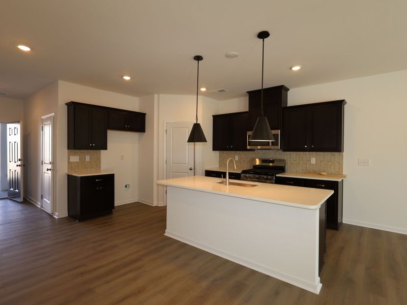 The first floor features an open-concept layout where the kitchen, breakfast area, and family room flow seamlessly together. The kitchen is finished with quartz countertops, ample cabinetry, and a functional island that anchors the space—perfect for casual meals or hosting guests.
