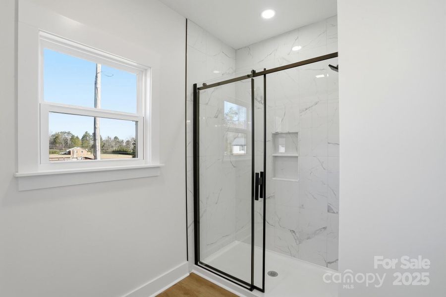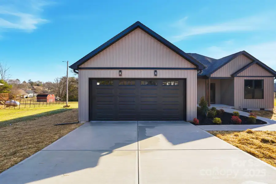 Welcome to an exceptional single level new construction home where modern design, natural textures, and elevated craftsmanship come together in perfect balance. From the moment you arrive, the home presents a striking first impression with storm toned board and batten siding, a stained tongue and groove porch ceiling, and bold black accents that include an eight foot garage door with windows, black window trim, and seamless gutters. An expansive eight by eighteen composite deck with black aluminum handrails extends the living space and offers a sophisticated setting for outdoor enjoyment. Inside, the open concept design is warm, inviting, and thoughtfully curated. Accent walls in the living room and bedrooms add architectural interest, while the electric glass fireplace anchors the main gathering area with modern ambiance. A custom shiplap feature unites the living room and kitchen for a seamless, designer inspired flow. Waterproof warm honey LVP floors extend throughout the home, complemented by LED lighting enhanced with a nightlight ring for soft evening illumination. The gourmet kitchen showcases real wood honey shaker cabinetry with soft close features, waterfall quartz prima countertops, and a layout designed for effortless entertaining. Spa inspired baths feature black real wood cabinetry, premium black fixtures, and Satori white and gray tile shower walls that deliver a refined, timeless aesthetic. Thoughtful details continue with a black glass barn door leading to the laundry room, a built in drop zone for everyday functionality, three panel craftsman doors, six inch baseboards with farmhouse trim, and sleek black hardware throughout. Every finish has been carefully selected to elevate both style and comfort. This home offers luxury living on a single level with craftsmanship that impresses at every turn. Great location with close proximity to the interstates, grocery stores, gas stations, shopping and restaurants.