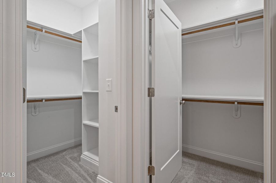 The primary bedroom offers its own bathroom fitted with dual sinks, a walk in shower, a separate water closet for privacy as well as TWO closets with built in shelving.