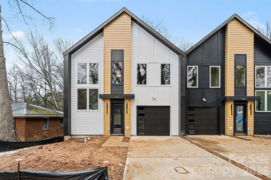 Welcome to the Crestview Duets — a rare opportunity to own a modern, design-forward home just minutes from Uptown Charlotte. This 3-bedroom, 2.5-bath residence blends bold contemporary exterior architecture with upscale interior finishes across an open 2,300-sq-ft layout. The home features a dramatic two-story stairway framed by oversized windows that flood the interior with natural light. The gourmet kitchen offers quartz countertops, soft-close cabinetry, upgraded gold and matte-black hardware, and an oversized island flowing seamlessly into expansive living spaces. A private office with glass doors, shiplap accents, RevWood flooring, 9’ ceilings with tray detail in the primary suite, walk-in closet, and spa-inspired baths elevate daily living — including a huge owner’s suite shower with rainfall head. Outside, enjoy an exceptionally deep, private backyard backed by a protected Tree Save area, plus a full-width Trex deck with privacy wall and covered patio — a rare level of outdoor space and seclusion. Located on a quiet residential street with space to breathe, yet steps from the Gold Line, walkable to the park, 5 minutes to Uptown, and 11 minutes to CLT Airport. No HOA. EV-ready garage. Move-in ready by mid-February.