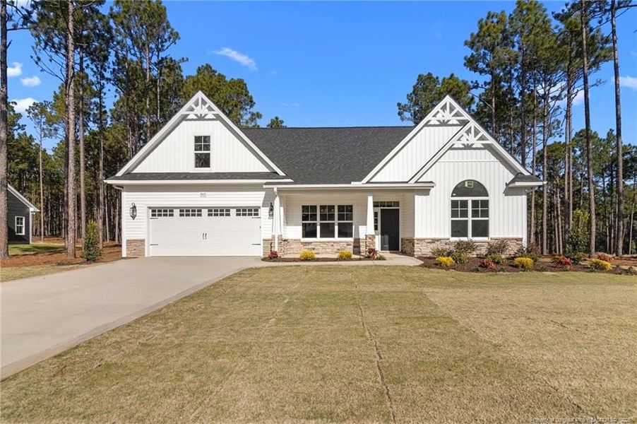 Stunning New Construction Home on 2.59 Acres – Modern Upgrades, Open Layout & Prime Location Near Fort Liberty (Bragg)! Discover luxury living in this gorgeous one-story new construction home nestled on 2.59 private acres in a small, gated community surrounded by mature trees and beautiful natural scenery. This thoughtfully designed home blends modern style with timeless details and offers the perfect combination of space, comfort, and convenience. Step inside the welcoming foyer with transom and sidelights, leading to an elegant formal dining room featuring upgraded lighting and classic wainscoting—perfect for hosting gatherings. Throughout the main living areas, you’ll find upgraded Portchester oak flooring, adding warmth and sophistication. The home features a split-bedroom layout, with two spacious bedrooms and a stylish shared hall bathroom on one side of the home. The heart of the home is the open-concept living room, complete with vaulted ceilings, abundant recessed lighting, a ceiling fan, and a sleek modern electric fireplace that creates a striking focal point.The chef-inspired kitchen is a showstopper, offering:• Stunning pendant lighting• Large island with seating• Level 3 quartz countertops• Beautiful designer tile backsplash• Deep farmhouse sink• 36” range with stainless vent hood• 42” upgraded cabinetry• Wall oven with multi-function microwave• Walk-in pantry with custom wood shelving. Additional main-level features include a half bath, a laundry room with extra cabinetry, and a covered rear porch with ceiling fans—easy to convert to a screened porch for year-round enjoyment. Upstairs, you'll find a private bedroom suite with a full bathroom and closet—ideal for guests, an office, or a teen suite. Outside, the home shines with upgraded landscaping, including full-yard grass, shrubs, and decorative plantings. The upgraded vinyl siding offers superior durability and curb appeal. With 2.59 acres, you have space to add a detached garage, workshop, or garden—while still enjoying the peaceful wooded surroundings. Located just minutes from Fort Liberty (Bragg) via 295, Methodist University, and a wide variety of shopping and dining on Ramsey Street, this home offers unmatched convenience in a beautiful, private setting. Zoned for excellent schools and tucked inside a gated community with large lots, this is a rare opportunity you don’t want to miss. Don’t wait—schedule your showing today and experience this exceptional new home for yourself!