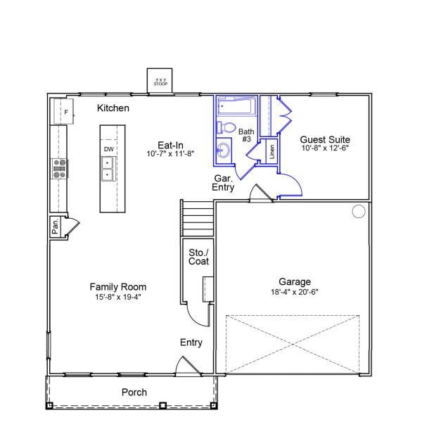 This home offers a functional layout with a main-level guest bedroom, perfect for guests or a home office. The kitchen includes a seven-foot island, granite Ashen White countertops, custom Purestyle White cabinetry, LED disc lighting, and a walk-in pantry for ample storage, along with a full suite of GE stainless steel appliances, including an electric range, over-the-range microwave, and dishwasher. Upstairs, the generously sized primary suite features a tray ceiling, plush carpet, and two walk-in closets, while the private bath offers a five-foot shower, double vanity with quartz countertops, luxury vinyl plank flooring, and a linen closet. A spacious open loft area provides the ideal spot for a playroom, media space, or home gym, and a large laundry room makes everyday chores a breeze.