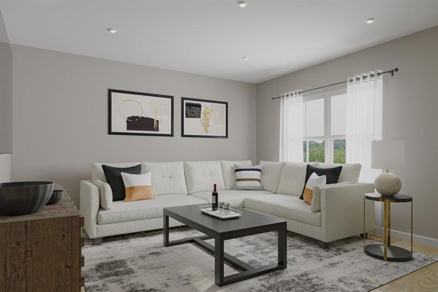 This end-unit Schuman quick move-in townhome offers modern living with flexible, thoughtfully designed spaces and a beautifully upgraded interior. The open layout features an expanded kitchen with upgraded quartz countertops, cabinetry, a tile backsplash, and stainless steel appliances, including a slide-in range and upgraded refrigerator. Hard-surface flooring throughout the first and second floors and upgraded LVP stairs add style and durability.A finished recreation room provides versatile living space, perfect for a guest suite, home office, or additional entertaining area. Upstairs, spacious bedrooms accommodate king-size furniture, while the private owner’s suite includes a tray ceiling, large closet, and a spa-like bath with tile surround Roman shower and bench seat. Additional highlights include a second-floor powder room, 9-foot ceilings on the second and third floors, and smart storage throughout.
