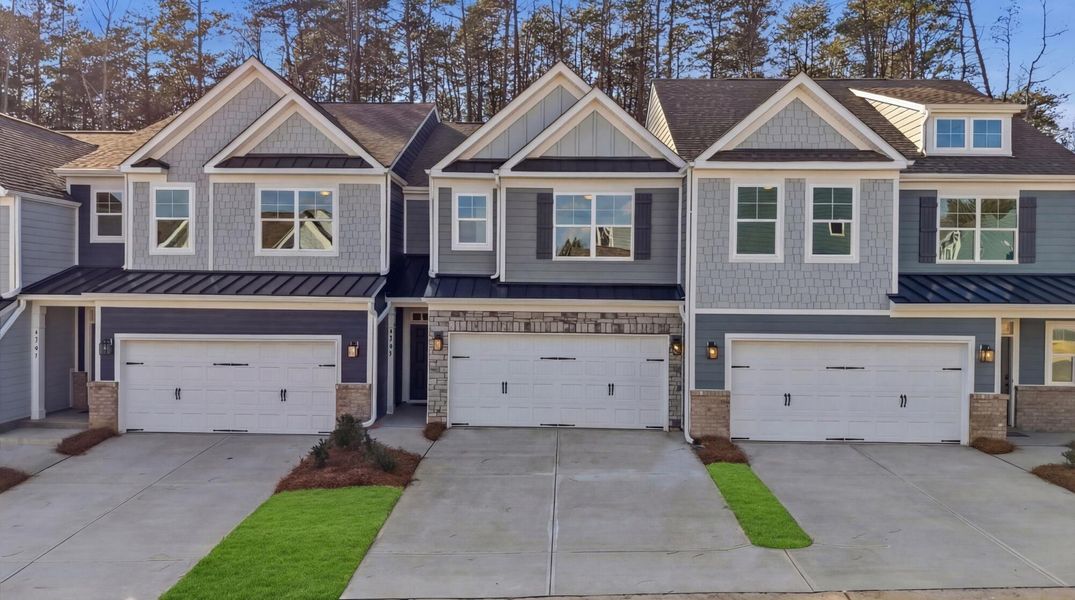 The Southampton is a three-bedroom, two-and-a-half-bath townhome with a two-car attached garage, kitchen, island and pantry, and spacious family room. The second floor features all three bedrooms including the primary bedroom with a tiled shower in the primary bath, two additional bedrooms, a laundry room, and a loft.