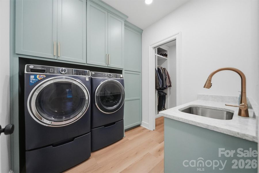 The primary bedroom features a vaulted ceiling and a spa-inspired ensuite bathroom with double quartz vanities, soaking tub, walk-in shower, bidet, and two walk-in closets—one of which connects directly to the laundry room with sink for exceptional convenience. Each additional bedroom includes its own en suite bathroom, walk-in closet, and a private washer/dryer combo unit, offering comfort, privacy, and independence.