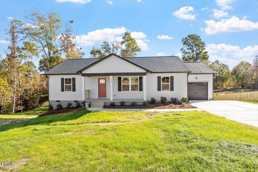 Completed in 2025, this single-story home is located on a 1.01-acre wooded lot at the end of a cul-de-sac street in Broadway, NC. The floor plan offers three bedrooms and two bathrooms with a split-bedroom layout designed for functional use of space. The kitchen is positioned between the dining area and family room, creating an open-concept arrangement that supports daily living and entertaining. Interior finishes include a combination of carpet, luxury vinyl flooring, and tile throughout the home.