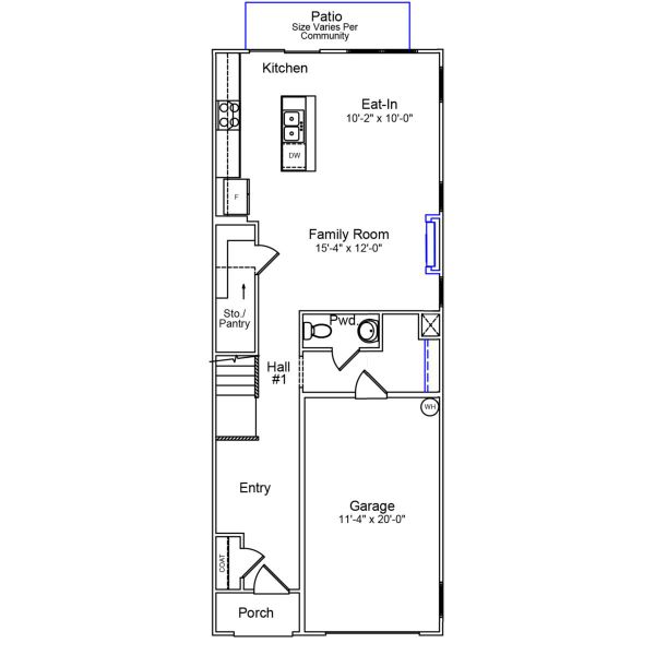 This two-story end unit townhome includes three bedrooms and two-and-one-half bathrooms. Immediately inside the entrance is a hallway that leads past the staircase and half bathroom and into the open-concept great room with an eat-in kitchen and patio. The primary suite features a walk-in closet, tray ceiling, and dual vanities. A laundry closet is located just outside the primary suite for ultimate convenience. Two secondary bedrooms and one full bathroom are also located upstairs. A one-car garage with a bench and cubby completes this floor plan.