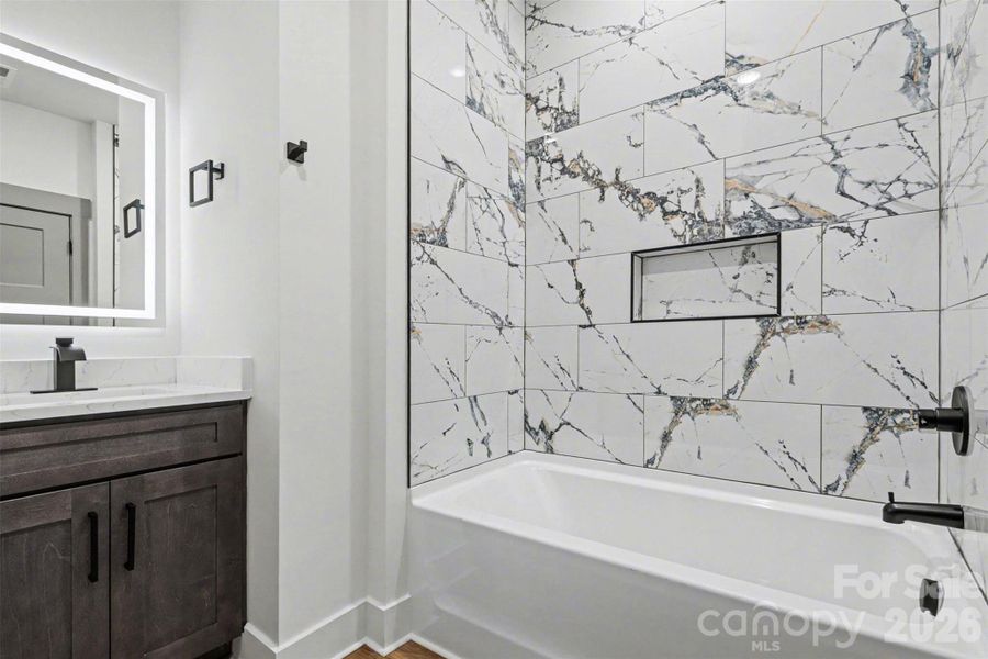 The living room includes a fireplace, and all appliances convey, making this home move-in ready! The primary suite offers a floor-to-ceiling tiled walk-in shower, LED mirrors, accent walls, and a spacious walk-in closet — all designed with a modern, elevated feel.