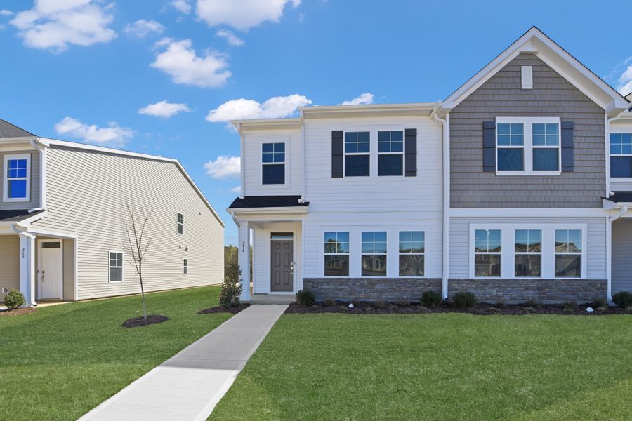 This two-story townhome design with a rear-load two-car garage delivers modern comfort and flow. The first-floor Great Room, dining room and kitchen are arranged in a convenient, open-concept layout to promote seamless transitions between spaces. The top level is occupied by a versatile loft that can function as another common area and all three bedrooms, including the spacious owner’s suite with an adjoining full-sized bathroom.
