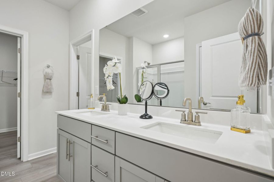 - Walk-In ClosetCrown MoldingFoyerPantryBlindsTray CeilingSeparate ShowerDouble Vanity