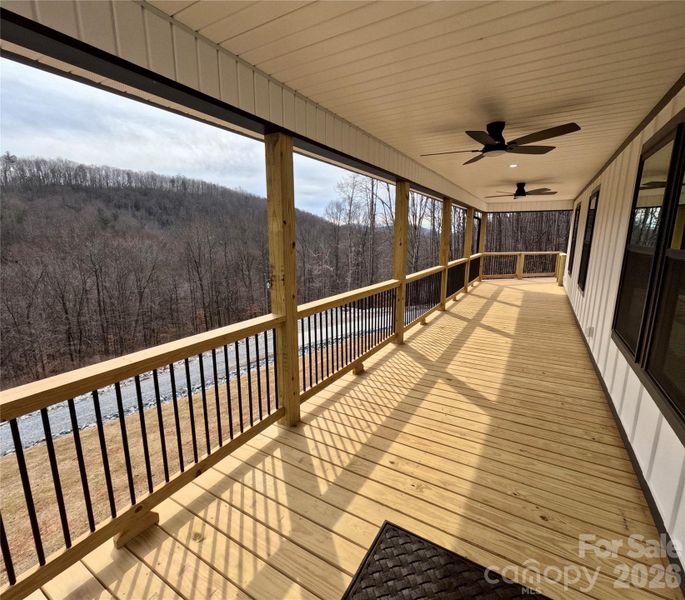 The spacious primary suite offers a large walk-in closet, double-sink vanity, and a tiled shower with a built-in bench. Step outside to the impressive 40-foot covered porch—perfect for relaxing and soaking in the views.