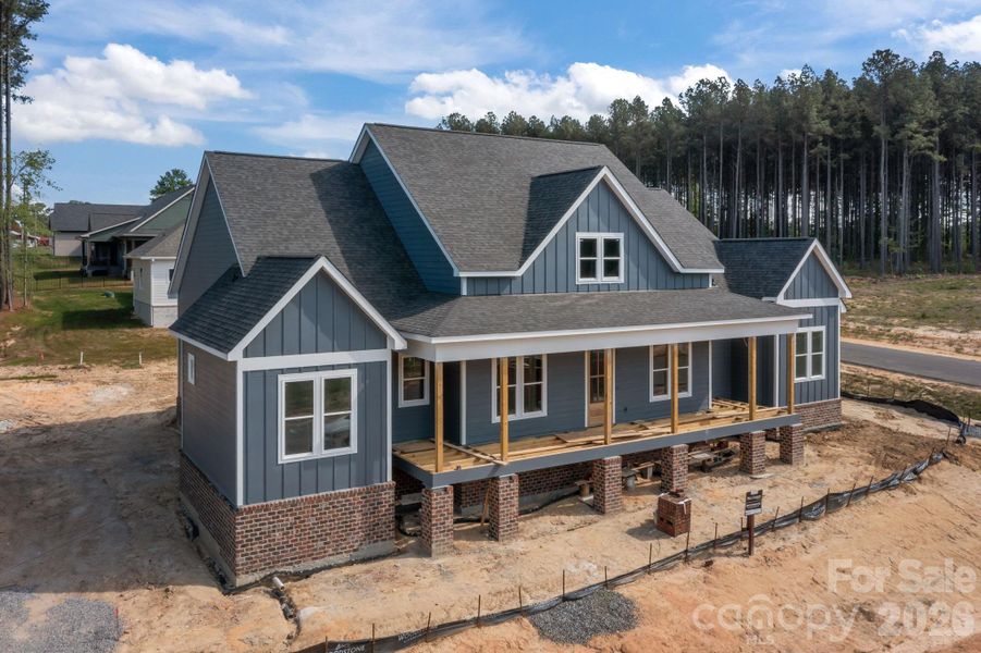 Luxury Custom Farmhouse Spec in Mills Garden at Woodstone. This beautiful new construction is set on a 0.29-acre lot and is set to be completed on 5/29/2026. Woodstone Communities “Ironwood” is a single-story ranch, approximately 2,802 sq ft with 4 bedrooms plus an office, 3.5 baths designed with upscale finishes and a thoughtful layout. The open chef’s kitchen is built for entertaining. It features custom cabinetry, upgraded quartz countertops throughout, gourmet Z-Line gas range and appliances. This opens to your living room area that features a gas fireplace, vaulted ceilings and a huge sliding panel patio door that opens to your large, covered porch with Trex decking allowing for indoor/outdoor entertainment. The primary suite offers a huge bedroom with vaulted ceilings, spacious walk-in closet with custom built-ins and dresser drawers, and a spa-inspired bath with soaking tub and custom tilework. Additional highlights include huge plank LVP flooring, tile and carpet flooring, custom wood shelving throughout. Exterior features Hardie siding with beautiful foundation brick veneer for lasting curb appeal. Includes a huge 3-car garage, sealed crawlspace foundation equipped with a dehumidifier.