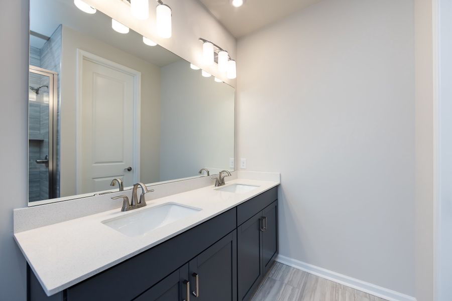 Set among mature tree lined streets at Fifteen 15 Cannon, 6017 Longar Lane offers a connected yet peaceful setting close to Uptown, NoDa, Camp North End, University and just 15 minutes from the airport. This Conrad plan is an end unit with added windows for abundant natural light, backs to a wooded area, and sits near community greenspace and walking trails. An extended 6' x 12' patio creates inviting outdoor living with both privacy and charm. Inside, a chef inspired kitchen anchors the first floor with a peninsula and large stainless steel farmhouse sink, white quartz countertops, a Zellige Neo Gesso Glossy tile backsplash, and rich grey cabinetry. Upstairs, the primary suite features a dual vanity and a shower with tiled walls and a tiled floor pan, delivering a refined and comfortable retreat.