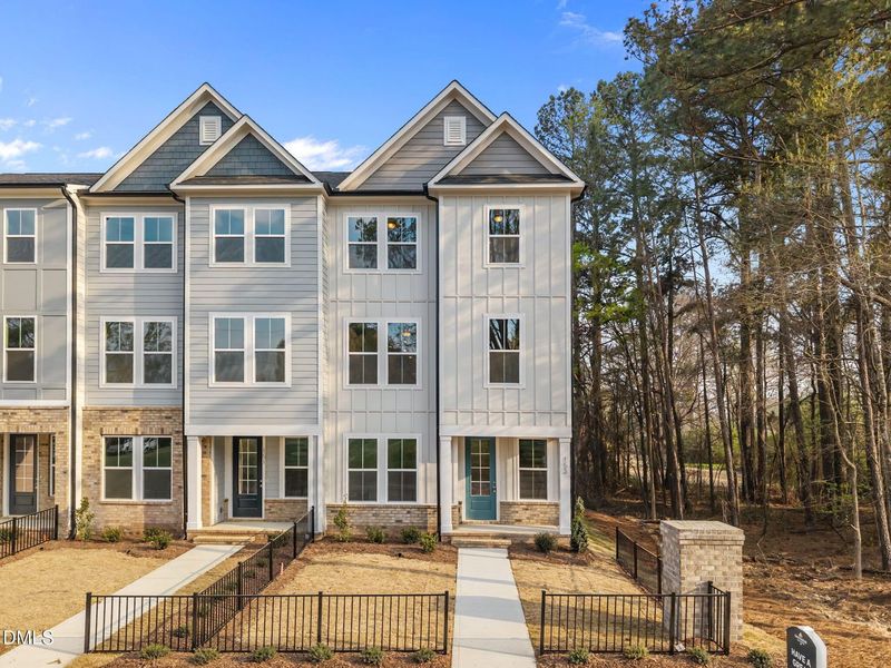 Ready Now! END UNIT overlooking wooded lawn! This 4-bedroom, 3.5 townhome in Camden Park's prime Knightdale location is ready to wow! The Avery offers 2,233 sq ft of well designed living space across 3 stories, featuring a popular first-floor guest bedroom with private bath. The extra wide oak wood staircase delivers you to a spacious pantry, gourmet kitchen with gas cooktop, quartz countertops, and center island, perfect for entertaining. The family room continues to deliver the wow with a linear fireplace feature. Upstairs, retreat to your luxurious primary suite complete with a spa shower featuring tile to ceiling and an oversized bench seat.