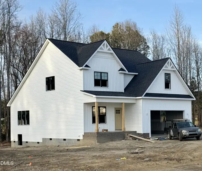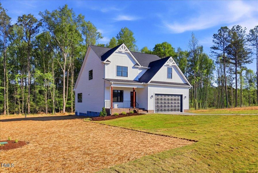Welcome to 261 Cherrybirch Lane, a beautifully crafted modern farmhouse offering the perfect blend of style, efficiency, and thoughtful upgrades throughout. This spacious home features a first-floor master suite with a trayed ceiling, a large walk-in closet with custom wooden shelving, and a spa-inspired bath showcasing a frameless glass walk-in shower, tiled to the ceiling, quartz vanity tops, and comfort-height fixtures. Upstairs, you'll find two additional bedrooms, a dedicated study, and a generously sized rec room, creating ideal spaces for work, play, and relaxation. The heart of the home is the gourmet kitchen, complete with LG stainless steel appliances, quartz countertops, a breakfast bar, under-cabinet lighting, a pantry with wooden shelving, and a smart island outlet with USB and wireless charging. The open living area features a vaulted ceiling and a smart WiFi-enabled electric fireplace, perfect for cozy evenings. Enjoy energy-efficient living with upgrades including a smart thermostat, 15.2 SEER2 heat pump, LED lighting, and multiple USB-integrated power features. Additional highlights include LVP flooring with pet-scratch warranty, designer light fixtures, an electronic front door lock, and ceiling fans in the living room and main bedroom. Relax outdoors on the screened-in back porch overlooking the wooded rear of the 1.35-acre lot, bordered by a natural branch for added privacy and charm. A two-car garage with a smart WiFi Genie operator completes this exceptional home.