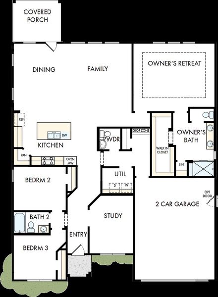 The heart of the home is a modern kitchen featuring top of the line Frigidaire appliances, including a wall oven and gas cooktop, along with a large island perfect for gathering and entertaining. The great room flows effortlessly to a covered back patio, creating a seamless indoor/outdoor space for relaxing or hosting friends.