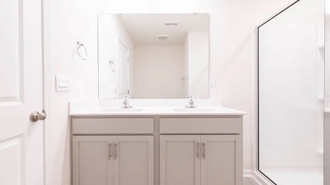 The Winston is a spacious two-story home featured at Middleton in Greensboro, NC. This home offers 4 bedrooms, 3.5 bathrooms, a 2-car garage, and 2,565 sq. ft. of living space. Upon entering, you’re greeted by a foyer leading to a home office and powder room. The open-concept main level features a large family room with a cozy fireplace and a gourmet kitchen with stainless steel appliances, a center island, and a spacious breakfast room. The primary suite includes a walk-in shower, dual vanities, and a walk-in closet. Right off the breakfast area is a patio for outdoor relaxation. Upstairs, the second primary suite provides a private retreat with an ensuite bathroom, walk-in shower, and dual vanities. The additional two bedrooms share a full bathroom. The laundry closet is conveniently located nearby. With its thoughtful design and spacious layout, the Winston is the perfect place to call home at Middleton.