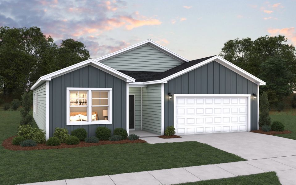 This thoughtfully designed Escape floor plan combines style and convenience with a layout perfect for modern living. Upon entering the foyer, you'll find two spacious secondary bedrooms that share a full bath, offering comfort and privacy for family members or guests. The home’s centerpiece is an open-concept living area that seamlessly integrates a spacious family room, a well-appointed kitchen with an inviting island, and a dining area ideal for gatherings. A door in the family room provides direct access to a covered porch, perfect for outdoor entertaining or quiet relaxation. A practical mud room off the garage entry adds convenience for everyday activities, helping to keep the home organized and tidy. The private primary suite is nestled at the rear of the home and features a spacious bedroom, a luxurious bathroom with dual sinks and a walk-in shower, and a walk-in closet. The laundry room is located off the main hall, easily accessible for all. This well-planned layout maximizes both comfort and functionality, making it perfect for any lifestyle.
