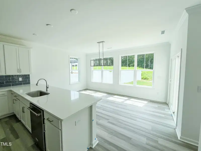 The heart of this residence is a chef-inspired kitchen that transitions seamlessly into the inviting great room. This massive culinary space features dual breakfast bars, gourmet stainless steel appliances, white cabinetry with matte black hardware, and a convenient walk-in pantry. Elegant MSI Calacatta Idillio quartz countertops finish the look, while a substantial central island provides additional seating. The great room itself features a stylish gas fireplace with a Bianco White granite surround, serving as a sophisticated focal point for gatherings. The adjacent dining room is bathed in natural light and further enhanced by a striking Madden Black light fixture. For added versatility, a dedicated front office or flex room offers a tranquil area for work or hobbies, while a main level rear extension provides even more spacious living.