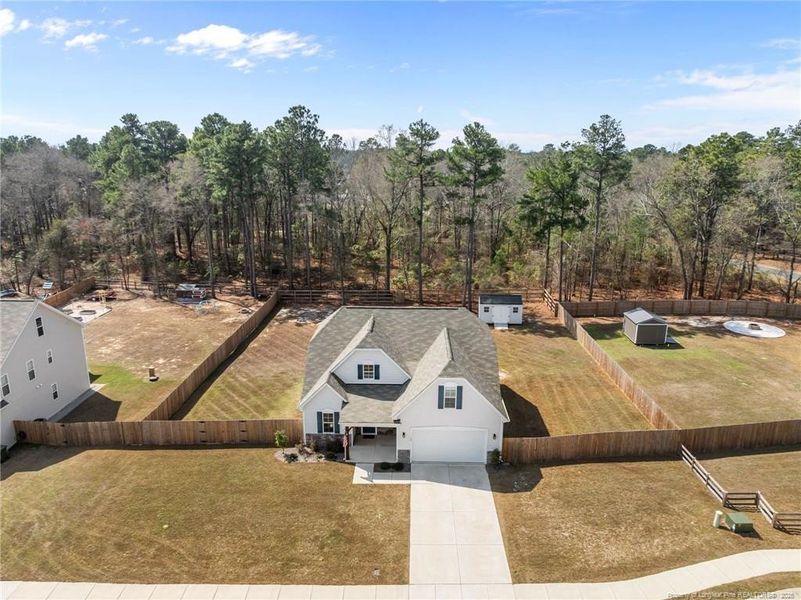 Beautiful, pristine home located in the desirable Woods Run community in Raeford! This inviting property features a spacious and functional floor plan with the primary suite conveniently located on the main level, offering privacy and comfort with its own en-suite bath. The home includes a bright living area and a well-appointed kitchen with plenty of cabinet and counter space. Upstairs, you will find a second living area and three additional bedrooms, providing plenty of space for family, guests, or a home office. Step outside to enjoy the fully fenced backyard, ideal for pets, play, or relaxing evenings outdoors. A storage shed provides convenient space for lawn equipment and additional storage. Conveniently located just minutes from Fort Bragg and close to Aberdeen, with easy access to shopping, dining, and everyday conveniences, this home offers the perfect blend of comfort and location.