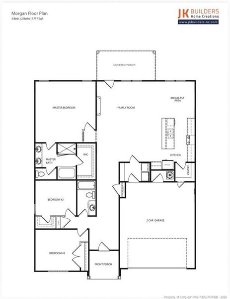 Welcome to the Morgan Floor Plan by JK Builders — a thoughtfully designed 3-bedroom, 2-bath home offering approximately 1,717 square feet of comfortable, functional living space. This split-bedroom layout provides privacy for the primary suite, which features a spacious bedroom, walk-in closet, and a well-appointed bath with dual vanities, soaking tub, and separate shower. Two additional bedrooms are located on the opposite side of the home with convenient access to a full hall bath. The heart of the home is the open-concept living area, where the family room flows seamlessly into the kitchen and breakfast area — ideal for everyday living and easy entertaining. The kitchen includes a center island, pantry, and direct access to the breakfast space overlooking the covered back porch. Additional highlights include a welcoming front porch, covered rear porch for outdoor enjoyment, dedicated laundry area, and a 2-car garage. A practical layout, comfortable proportions, and intentional design make this plan a great fit for a variety of buyers looking for easy, single-level living.