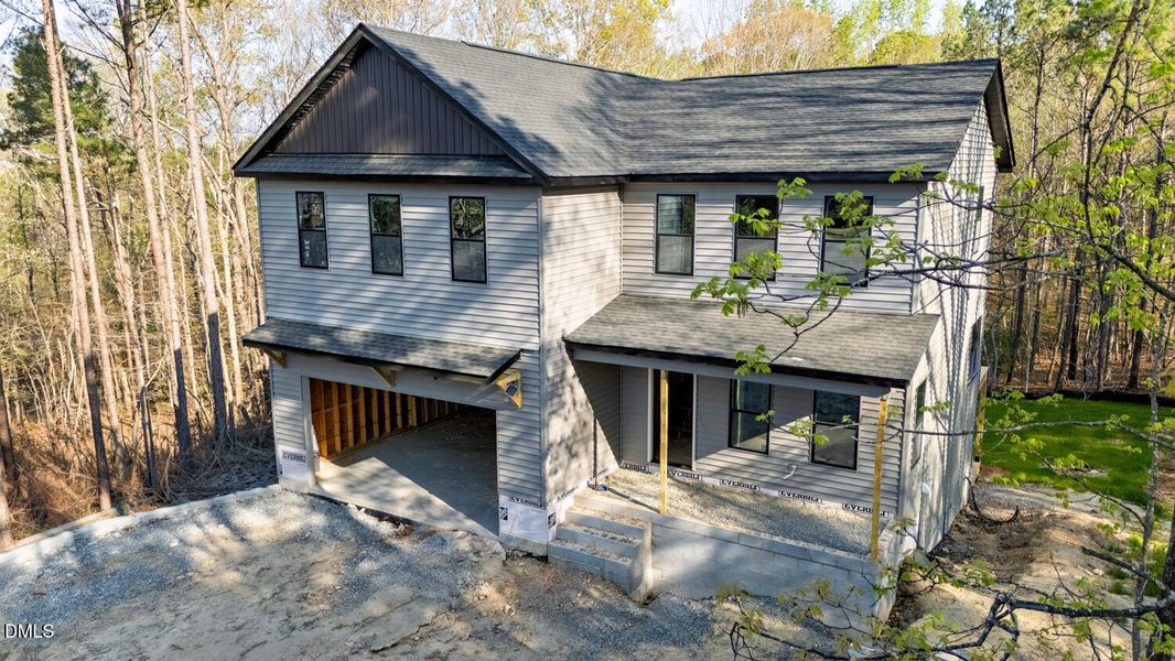 Outdoor living includes a covered front porch, rear deck, and patio, all designed to complement the wooded setting. The spaces offer both privacy and functionality for entertaining and relaxation.