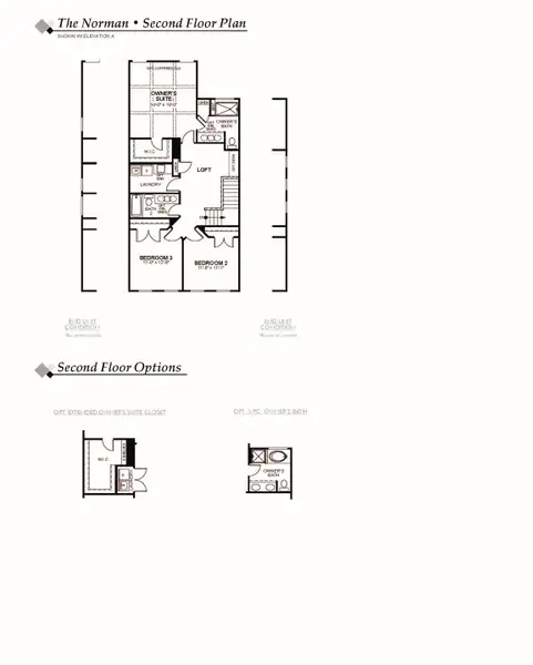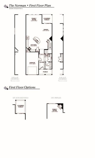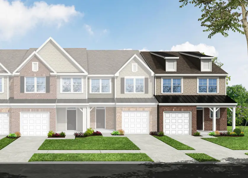 The Norman is a two-story, three-bedroom, two-and-a-half-bath end-unit townhome with a one-car attached garage, spacious and open kitchen, dining area, and family room, plus a covered rear porch. The second floor features the primary suite, two additional bedrooms, a hall bath, a laundry room, and a loft area.