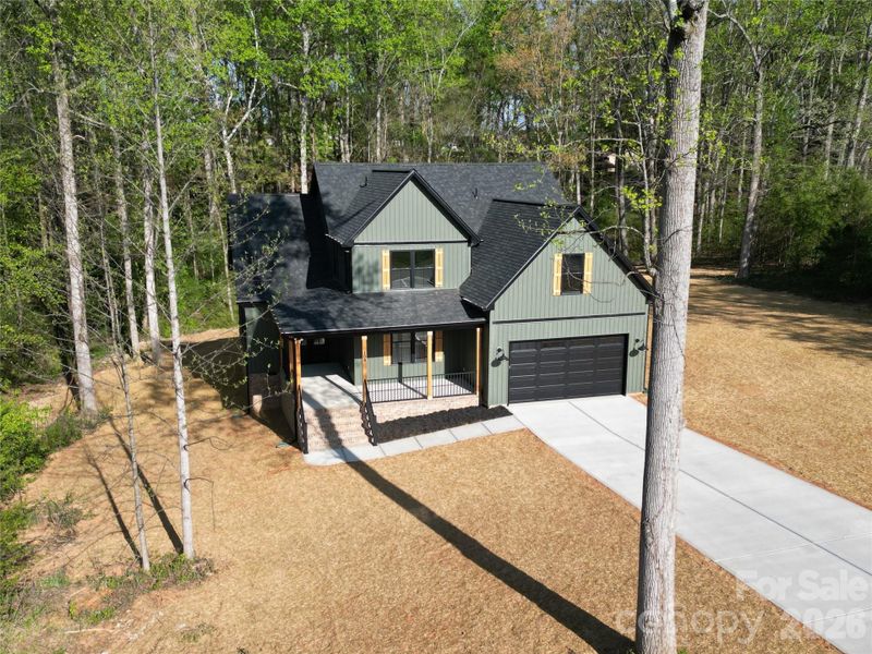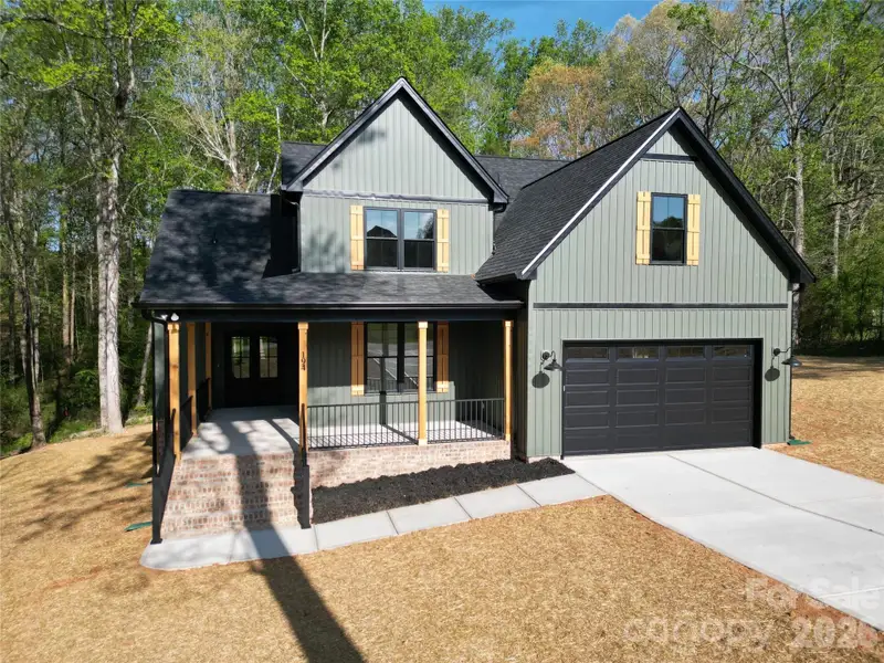 Outside, enjoy the charm of a welcoming covered front porch with wood accents, perfect for relaxing evenings. The home’s exterior showcases a tasteful combination of modern siding, brick foundation, and clean architectural lines, all complemented by a private, generously sized lot.