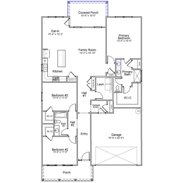 The Durham II is a one-story home featuring three bedrooms and two bathrooms. The kitchen opens to the great room and eat-in and includes an island with a breakfast bar and two pantries for ample storage space. The primary suite is just off the great room and features a linen closet, water closet, and large walk-in closet. Two secondary bedrooms, each with its own walk-in closet, are located at the front of the home. The garage entry is tucked away with a conveniently located coat closet.
