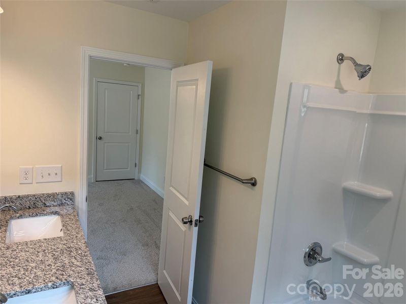The primary bedroom suite includes plush carpeting and a private ensuite bath with a dual-sink granite vanity and contemporary finishes. Two additional bedrooms provide flexibility for guests, a home office, or additional living space.