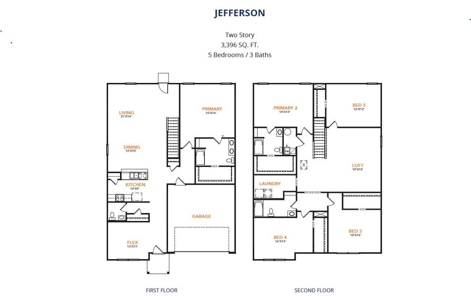 The Jefferson Plan from our Liberty Series redefines spacious living, offering a layout designed for ultimate comfort and convenience. This 2-story home features 5 bedrooms, 3 bathrooms, a 2-car garage, and a generous 3,396 square feet of living space. This unique plan includes two primary bedrooms, each with a private bathroom — one conveniently located on the main level and the other on the upper level, offering flexible living options for multigenerational families or hosting long-term guests.